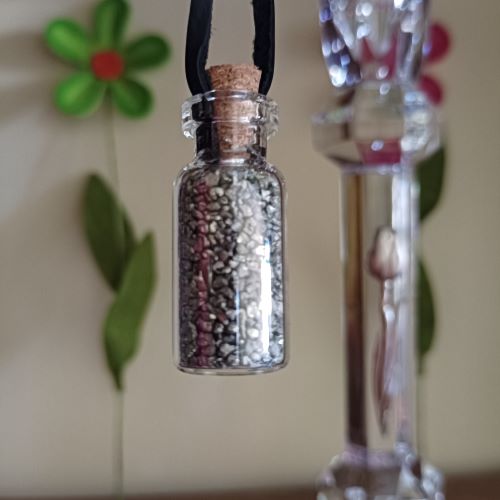 Material: Tubo de cristal, con tapón de corcho y piedras preciosas naturales